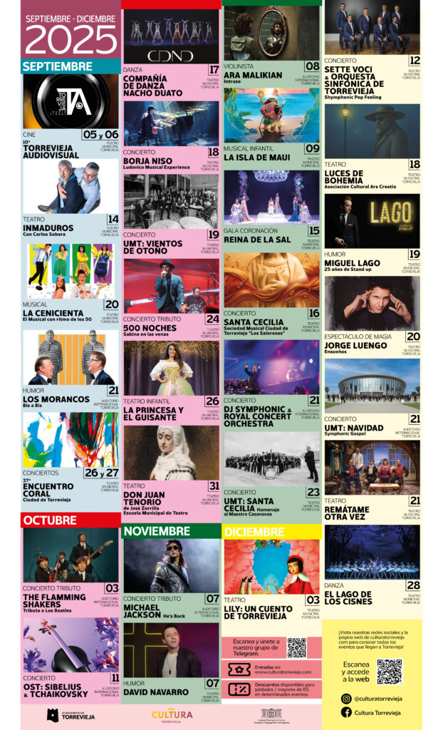 Great productions such as “Estado de Alarma” with Lara Dibildos, “Inmaduros” with Carlos Sobera, “Remátame Otra Vez” with Belinda Washington, “Intruso” by Ara Malikian and “El Lago de Los Cisnes”; along with comedy shows by Miguel Lago, David Navarro, Juan Amodeo and also Los Morancos; the magic of Jorge Luengo, the concert with DJ of the Royal Concert Orchestra, tributes to Sabina, Michael Jackson, Vaiana and The Beatles, and a variety of shows with local talent, make up the program of the September-December 2025 season of Torrevieja Culture.